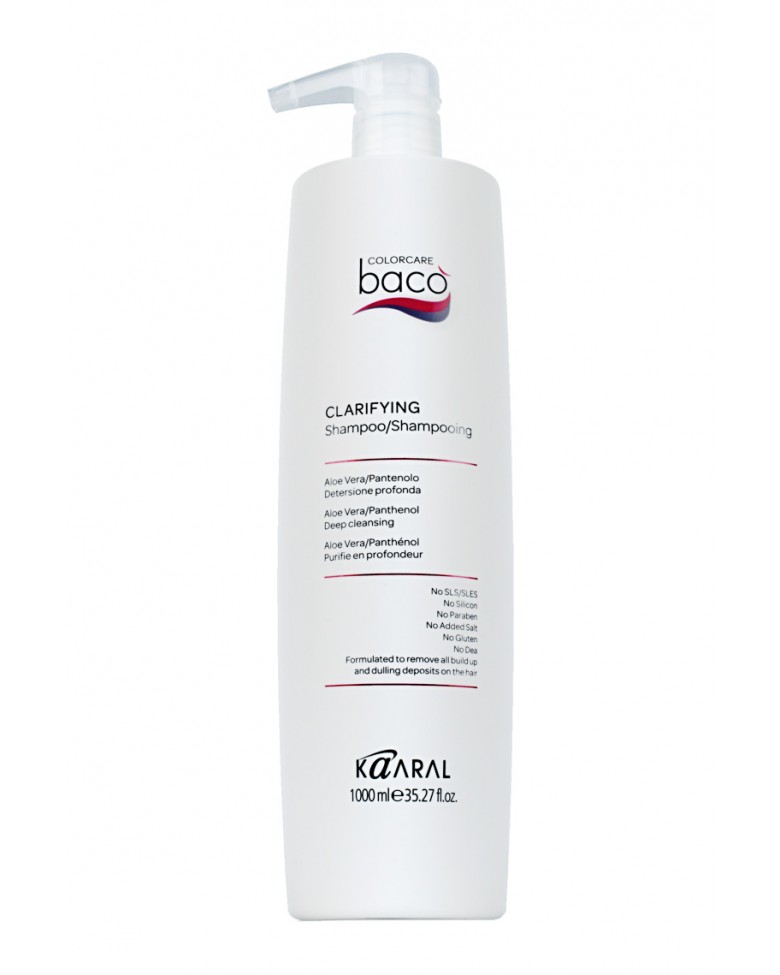 - Шампунь для глубокого очищения BACO CLARIFYING SHAMPOO глубоко очищает и увлажняет волосы, удаляет глубокие накопления и загрязнения в волосах и коже головы, такие как хлор, соли тяжёлых металлов и минералы, содержащиеся в жёсткой воде и окружающей среде, а также остатки стайлинговых средств. Может применяться перед любыми процедурами. Формула шампуня обогащена Алоэ Вера и Пантенолом, которые увлажняют, придают мягкость, эластичность и блеск волосам.